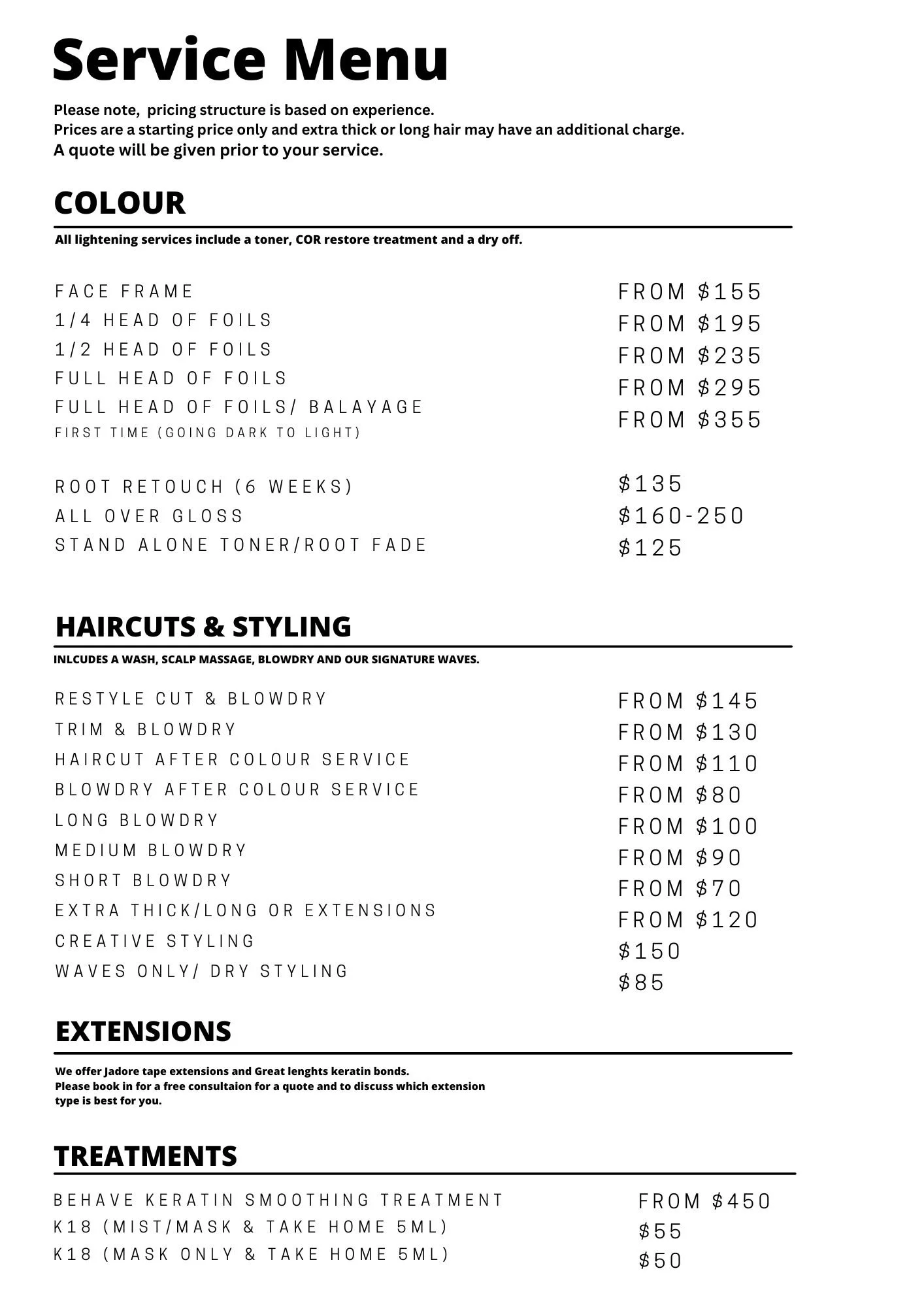 All new clients are required to pay a $50 deposit to secure there booking. This deposit comes off the total bill on the day. Cancellations made with less than 48 hours notice or no shows will forfeit their deposit. Your deposit is not refundable.